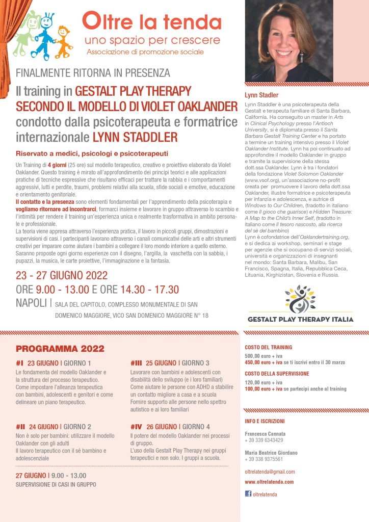 Un Training di 4 giorni (25 ore) sul modello terapeutico, creativo e proiettivo elaborato da Violet Oaklander. Questo training è mirato all’approfondimento dei principi teorici e alle applicazioni pratiche di tecniche espressive che risultano efficaci per trattare la rabbia e i comportamenti aggressivi, lutti e perdite, traumi, problemi relativi alla scuola, sfide sociali ed emotive, educazione e orientamento genitoriale.