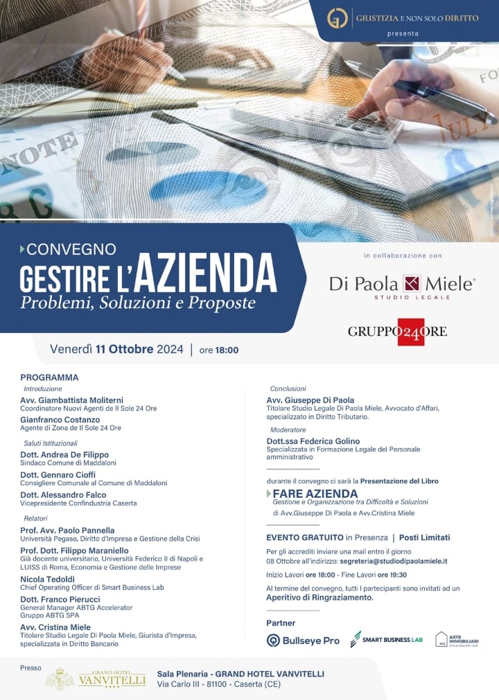 Lo Studio Legale DI PAOLA – MIELE è lieto di presentare il convegno dal titolo “GESTIRE L’AZIENDA Problemi, Soluzioni e Proposte”, che si terrà venerdì 11 Ottobre 2024, presso la Sala Plenaria del Grand Hotel Vanvitelli, Via Carlo III – 81100 – Caserta (CE).