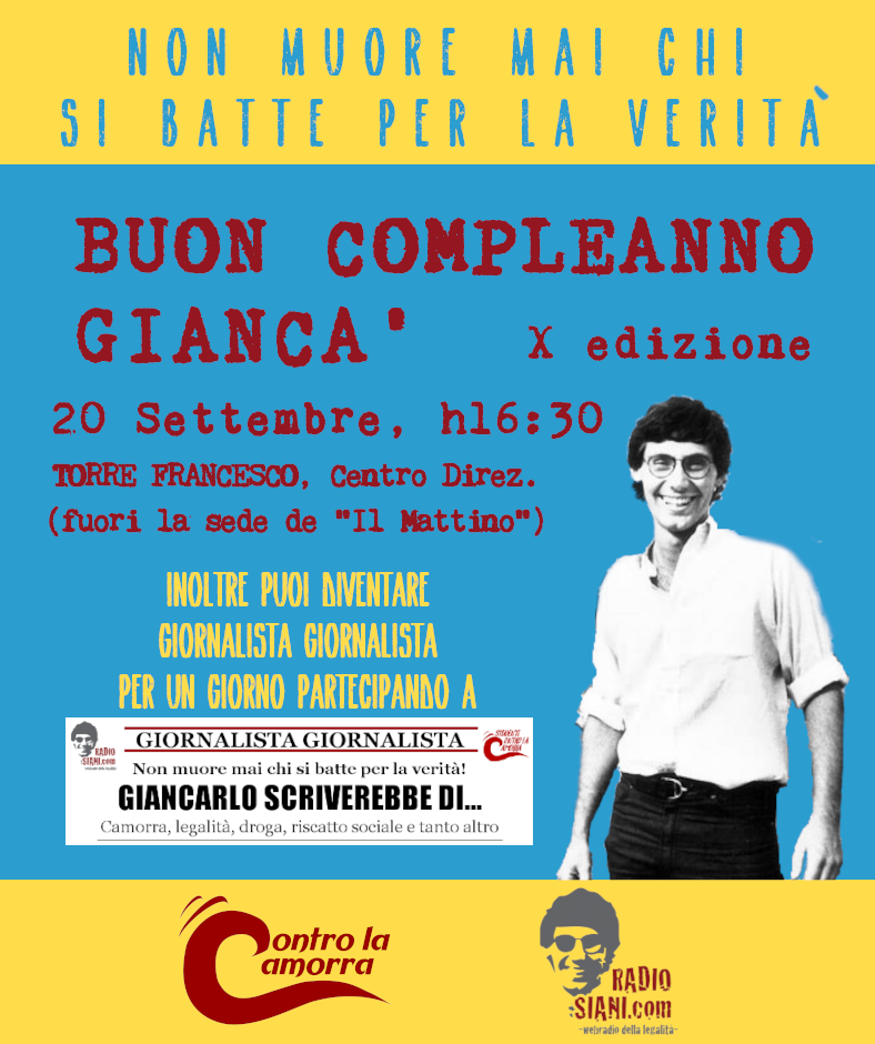 Oltre l’evento “Buon compleanno Gianca’”, ormai giunto alla decima edizione, infatti, l’associazione ‘Contro la Camorra’ e Radio Siani hanno lanciato “Giancarlo scriverebbe di”, contest giornalistico aperto a tutti. Diventare “Giornalista Giornalista per un giorno” è semplice: basta inviare, all’indirizzo ass.controlacamorra@gmail.com, entro il 18 settembre, un articolo relativo a una storia di camorra, a un fatto di cronaca o ad una storia di riscatto sociale. I tre articoli che vinceranno saranno pubblicati su Il Mattino online e su RadioSiani.com il 23 settembre, anniversario della morte di Giancarlo Siani.