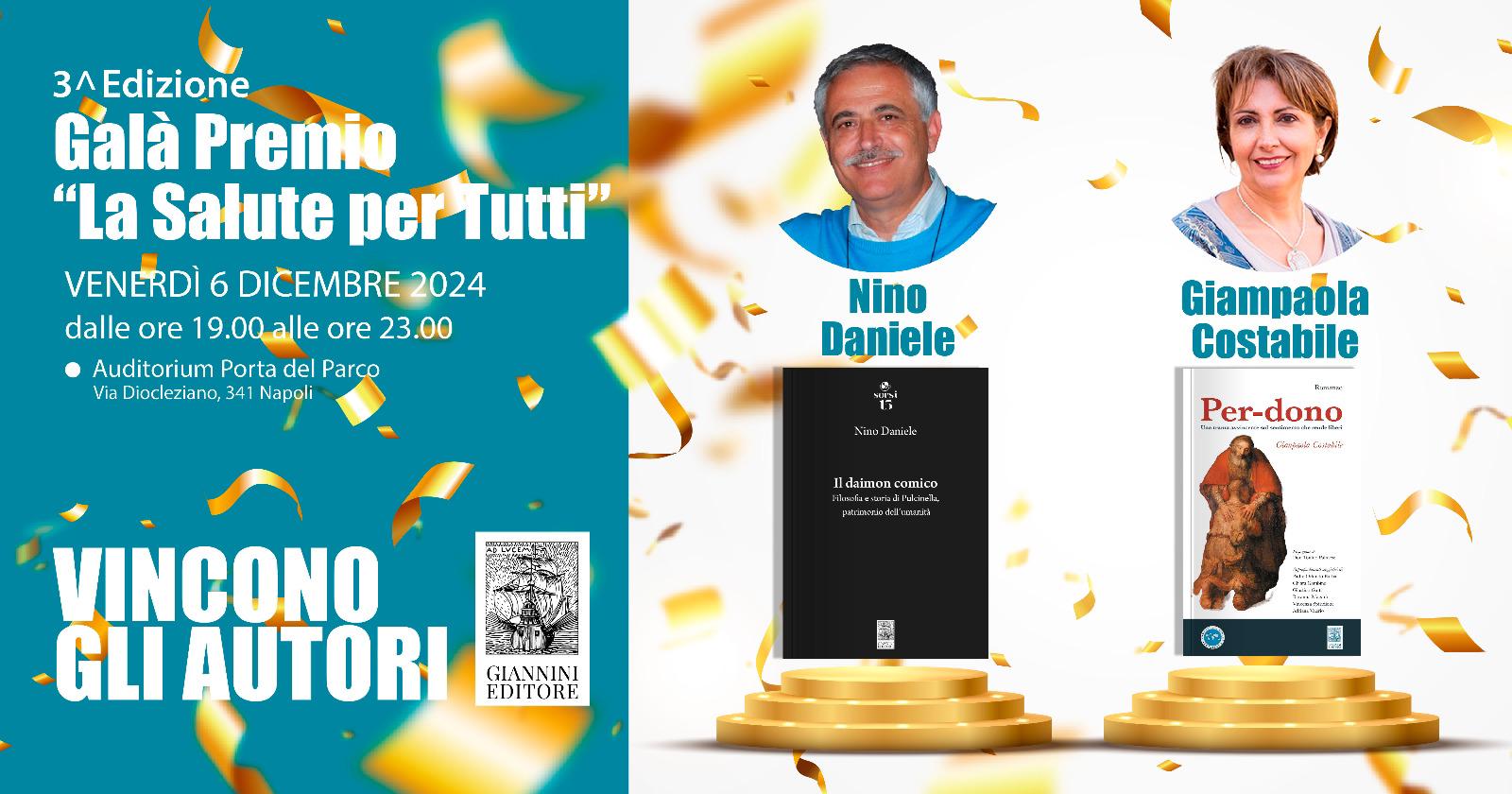 Verranno premiati per la sezione cultura del “Premio la Salute per Tutti Nascita-Rinascita”, venerdì 6 dicembre, gli autori della Giannini Editore Gianpaola Costabile e Nino Daniele, rispettivamente per i libri “Per-dono” e “Il daimon comico”. La cerimonia di premiazione si terrà dalle ore 19 presso ’auditorium Porta del Parco, via Diocleziano 343.