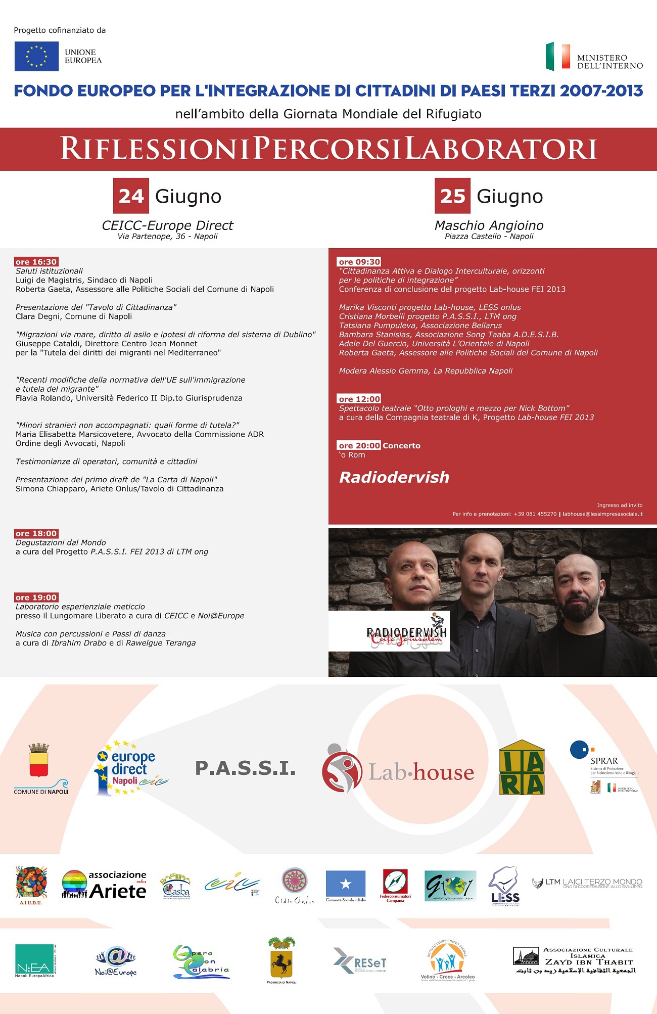 In merito alla Giornata Mondiale del Rifugiato, il 24 e 25 giugno 2015, il Tavolo di Cittadinanza coordinato dal Servizio Cooperazione decentrata, legalità e Pace/CEICC del Comune di Napoli insieme con gli enti promotori dei progetti Lab-house e P.A.S.S.I., organizzano due giorni di iniziative, riflessioni e confronti sul tema dell‘accoglienza e delle politiche di inclusione sociale dei migranti.