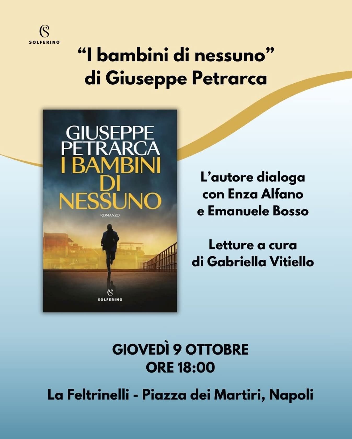 Giovedì 9 ottobre alle ore 18:00, presso La Feltrinelli di Piazza dei Martiri a Napoli, si terrà la presentazione del nuovo romanzo di Giuseppe Petrarca, I bambini di nessuno, edito da Solferino.
