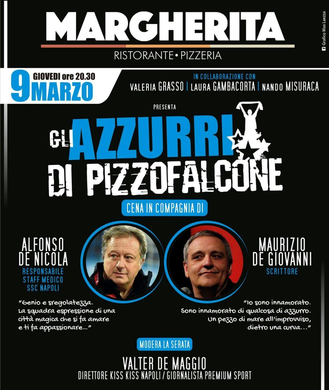 Giovedì 9 marzo alle ore 20,30 presso il ristorante Margherita (Riviera di Chiaia 271, Napoli) appuntamento con “Gli azzurri di Pizzofalcone“; chiacchierata su Napoli e sulla squadra del Napoli in compagnia di Maurizio de Giovanni e Alfonso De Nicola, due grandi professionisti che portano lustro, ciascuno nel proprio campo, al capoluogo partenopeo.