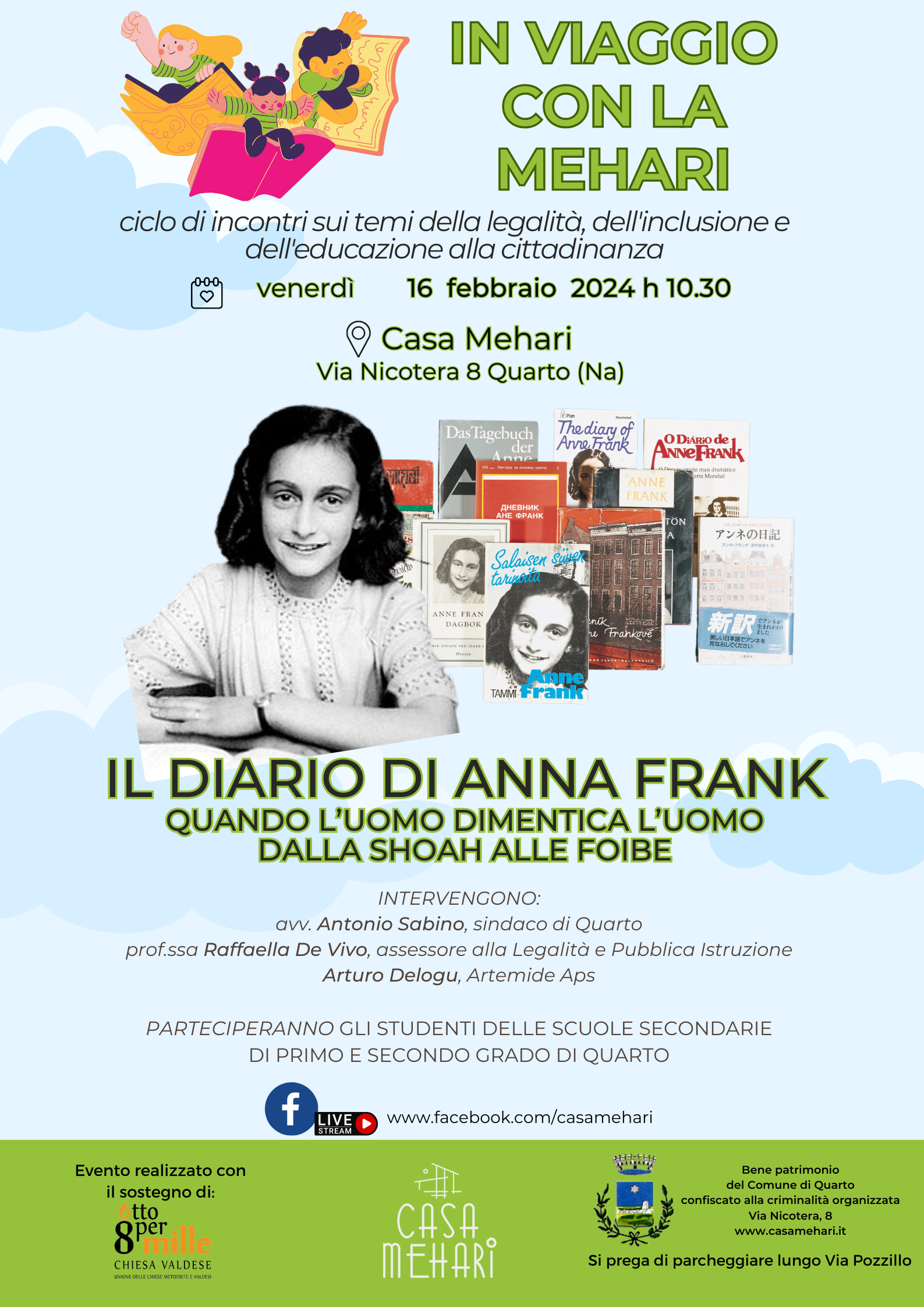 L’iniziativa è parte della V edizione del progetto “Quando l’uomo dimentica l’uomo, dalla Shoah alle Foibe” voluto dal Comune di Quarto con il coinvolgimento delle scuole della città. Quest’anno una sezione della manifestazione è stata riservata al “Diario di Anna Frank”. I ragazzi hanno preparato testi, video, disegni, poesie e cartelloni dedicati all’argomento. I materiali saranno esposti a Casa Mehari.