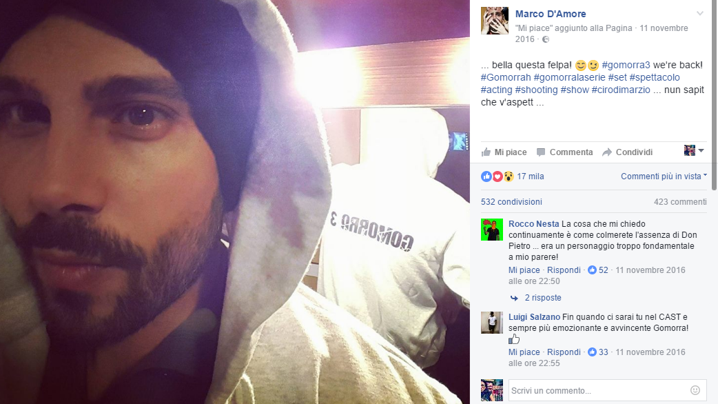 A scatenare i fan sul web è un post di Salvatore Esposito, alias Genny Savastano, che ha pubblicato una foto del ciak e la frase ‘Day 41 #Gomorra3. Si ricomincia !!!‘ Qualche settimana fa anche Marco D’Amore, alias Ciro Di Marzio, aveva pubblicato sui social delle foto dove annunciava entusiasta la terza serie.