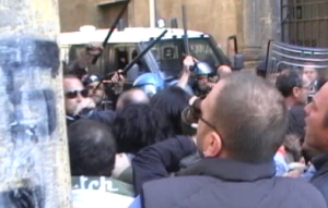Bastano pochi manifestanti pacifici per far saltare i nervi a poliziotti e carabinieri, che usano la forza in maniera esagerata e spropositata contro normali cittadini che chiedevano di incontrare Cesaro o Rispoli. Si tratta degli esponenti dei Comitati contro le discariche di Chiaiano, Mugnano e Marano, che avevano organizzato l’evento: “Occupy Cesaro”. Road Tv Italia non vuole condannare gli operatori delle forze dell’ordine, quanto chi ha diretto e organizzato la loro disposizione in campo, con uomini schierati in forza e in tenuta anti-sommossa contro poche decine di manifestanti che non avevano affatto intenzioni violente. Già ieri i cittadini che avevano occupato la Provincia hanno dichiarato di essere stati “sgombrati” con le maniere forti. Solo dopo questi tafferugli, dopo le manganellate e nella tensione generale una delegazione dei Comitati e’ stata ricevuta dal Presidente del Consiglio Provinciale Rispoli…