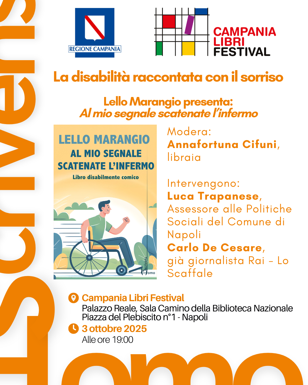 Lello Marangio, invece, presenterà il romanzo Al mio segnale scatenate l’infermo. Libro disabilmente comico in un incontro dal titolo La disabilità raccontata con il sorriso. L’evento è previsto venerdì 3 ottobre alle ore 19:00, alla Sala Camino della Biblioteca Nazionale di Napoli all’interno di Palazzo Reale. La libraia Annafortuna Cifuni, modererà la chiacchierata tra Luca Trapanese, Assessore alle Politiche Sociali del Comune di Napoli, Carlo De Cesare, già giornalista Rai – Lo Scaffale, e l’autore.