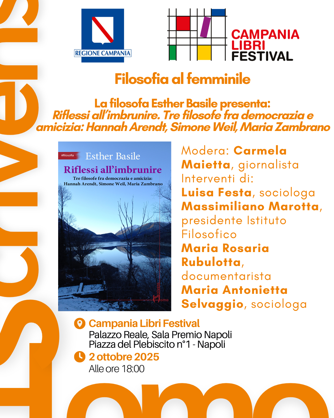 Esther Basile e Lello Marangio. La prima presenterà Riflessi all’imbrunire. Tre filosofe fra democrazia e amicizia: Hannah Arendt, Simone Weil, Maria Zambrano in un incontro dal titolo Filosofia al femminile. Ci si vede giovedì 2 ottobre alle 18:00 alla Sala Premio Napoli. A moderare i vari interventi, la giornalista Carmela Maietta. Assieme all’autrice, le sociologhe Luisa Festa e Maria Antonietta Selvaggio; Massimiliano Marotta, presidente Istituto Filosofico; Maria Rosaria Rubulotta, documentarista.