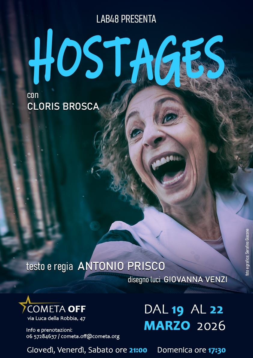 Una donna sola, dimenticata da tutti, che trova rifugio in una stanza che dovrebbe essere chiusa. E da lì dà sfogo ai suoi pensieri, trasformando il delirio in poesia, la follia in testimonianza. È il cuore pulsante di “Hostages”, il nuovo spettacolo scritto e diretto da Antonio Prisco, con Cloris Brosca come unica interprete in scena. Il disegno luci è firmato da Giovanna Venzi.