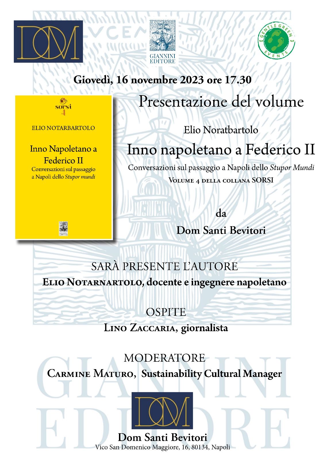 Ad inaugurare la rosa di presentazioni giovedì 16 novembre alle 17,30 l’ingegnere e docente napoletano Elio Notarbartolo con il suo “Inno napoletano a Federico II”. Modera Carmine Maturo sustainability cultural manager. Ospite il giornalista Lino Zaccaria.