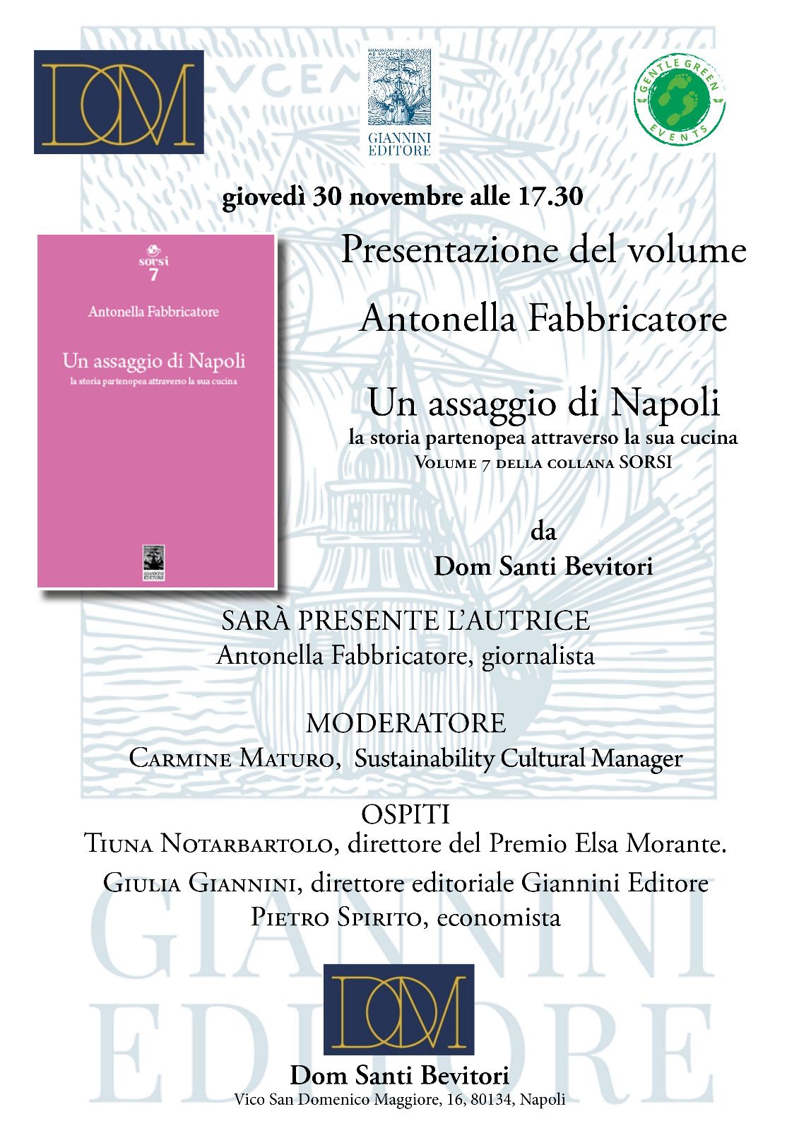Termina gli appuntamenti del mese, la giornalista Antonella Fabbricatore che presenterà il suo libro “Un assaggio di Napoli” giovedì 30 novembre alle 17,30. Modera Carmine Maturo sustainability cultural manager. Ospiti il direttore del Premio Elsa Morante Tiuna Notarbartolo, il direttore editoriale della casa editrice Giulia Giannini e l’economista Pietro Spirito.