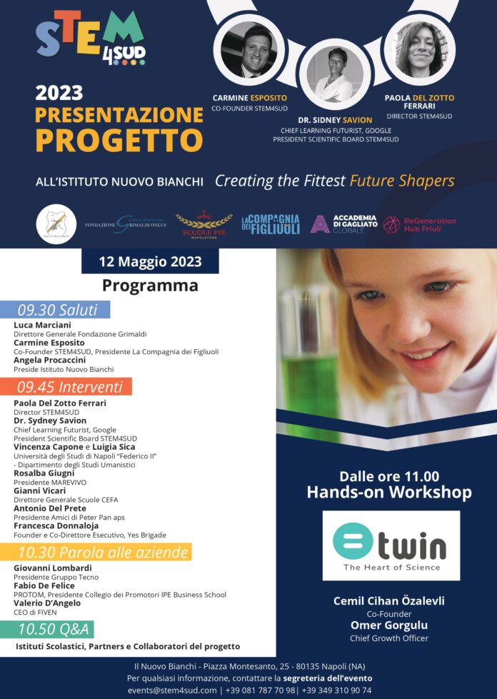 Preparare le giovani generazioni a cogliere le opportunita’ che vengono dall’innovazione tecnologica e dalla transizione ecologica. Con quest’obiettivo il 12 maggio prossimo verrà lanciato a Napoli, il progetto STEM4SUD (https://stem4sud.org): l’iniziativa promossa da un gruppo di associazioni ed imprese guidata dalla Compagnia dei Figliuoli (https://