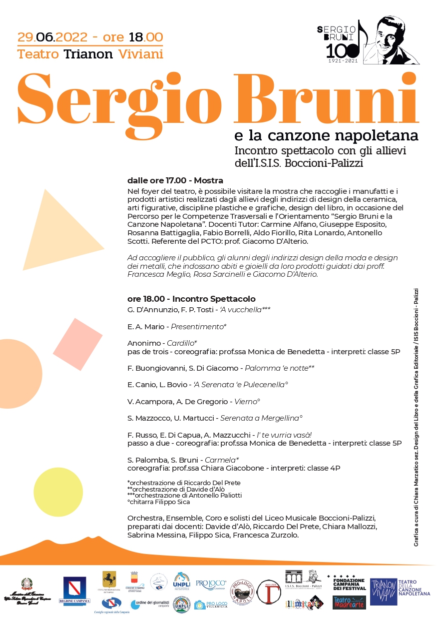 Nomi e cognomi di lustro che daranno ancora più lustro al ricordo musicato e coreografato in onore di Sergio Bruni, qui però anche rappresentante postumo dell’intera tradizione della canzone napoletana e, perché no, anche della nostra lingua. E per cogliere il senso di tutti questi buonissimi propositi conviene andare al Teatro Trianon Viviani di Napoli già dalle 17, dove nel Foyer sarà possibile visitare la mostra che raccoglie manufatti e prodotti artistici realizzati dalle studentesse e dagli studenti degli indirizzi di Design della Ceramica, Arti figurative, Discipline plastiche e grafiche, Design del Libro dell’ISIS “Boccioni-Palizzi” di Napoli, in occasione del Percorso per le Competenze Trasversali e l’Orientamento “Sergio Bruni e la canzone napoletana”, guidati dai docenti tutor e dal referente Giacomo D’Alterio. Ad accogliere il pubblico, le studentesse e gli studenti degli indirizzi di Design della Moda e Design dei Metalli che indossano abiti e gioielli da loro prodotti. Il programma del concerto prevede “Presentimento” di EA Mario e “Cardillo”, con un pas de trois coreografato da Monica de Benedetta, di compositore anonimo; “Palomma ‘e notte” di Francesco Buongiovanni e Salvatore Di Giacomo con orchestrazione di Davide D’Alò; “I’ te vurria vasà!” di Ferdinando Russo, Eduardo Di Capua ed Alfredo Mazzucchi, “A vucchella” di Gabriele D’Annunzio e Francesco Paolo Tosti, “A Serenata ‘e Pulecenella”, chitarra di Filippo Sica, di Enrico Cannio e Libero Bovio, “Vierno”, chitarra di Filippo Sica, di Vincenzo Acampora e Armando De Gregorio, “Serenata a Mergellina”, chitarra di Filippo Sica, di Salvatore Mazzocco ed Umberto Martucci, “”Carmela” di Salvatore Palomba e Sergio Bruni con orchestrazione di Riccardo Del Prete e coreografie di Chiara Giacobone. “Sono molto felice di poter vivere quest’ennesimo momento di cultura con le studentesse, gli studenti e la cittadinanza tutta – chiosa la dirigente dell’ISIS Boccioni-Palizzi di Napoli – a dimostrazione che quando si alza l’asticella della qualità si conseguono risultati incredibili. Ormai il Boccioni-Palizzi è un ensemble che funziona dentro e fuori le proprie quattro mura e per i giovani talenti sono occasioni imperdibili.”