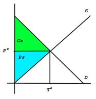 Dove S è l’offerta, D la domanda, p* il prezzo generico dei beni e q* la quantità genericamente scambiata dei beni. Le aree evidenziate rappresentano insieme il welfare, più è ampio questo spazio e più il benessere materiale della società è assicurato, trattiamo qui però di un caso totalmente esente da imposta. Andiamo però a vedere cosa succede quando si introduce un’imposta come l’IVA (che chiameremo “T”).