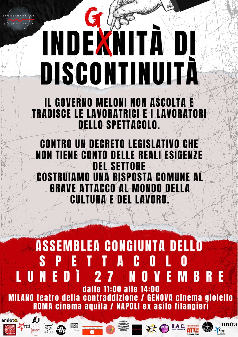 Le lavoratrici e i lavoratori del settore spettacolo, le associazioni di categoria, i coordinamenti autorganizzati e i sindacati respingono unitariamente l’impostazione data dal governo al decreto legislativo volto al riordino e alla revisione degli ammortizzatori e delle indennità in materia di spettacolo e annunciano per oggi, lunedì 27 novembre, la mobilitazione in tutta Italia.