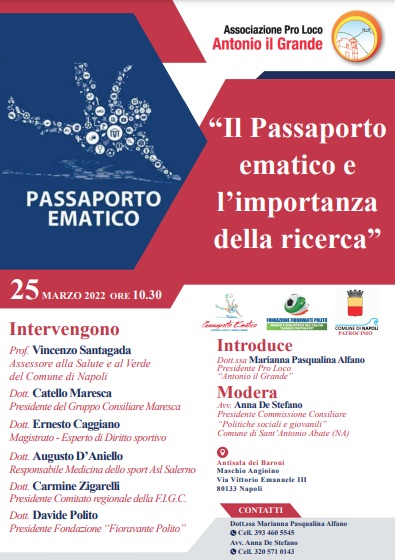 Venerdì 25 marzo presso l’antisala dei Baroni si terrà il convegno “Passaporto ematico” promosso dall’associazione Pro Loco Antonio il Grande e dall’Avv. Anna De Stefano, Consigliere comunale di Sant’Antonio Abate, in collaborazione con la Fondazione “Fioravante Polito”.
