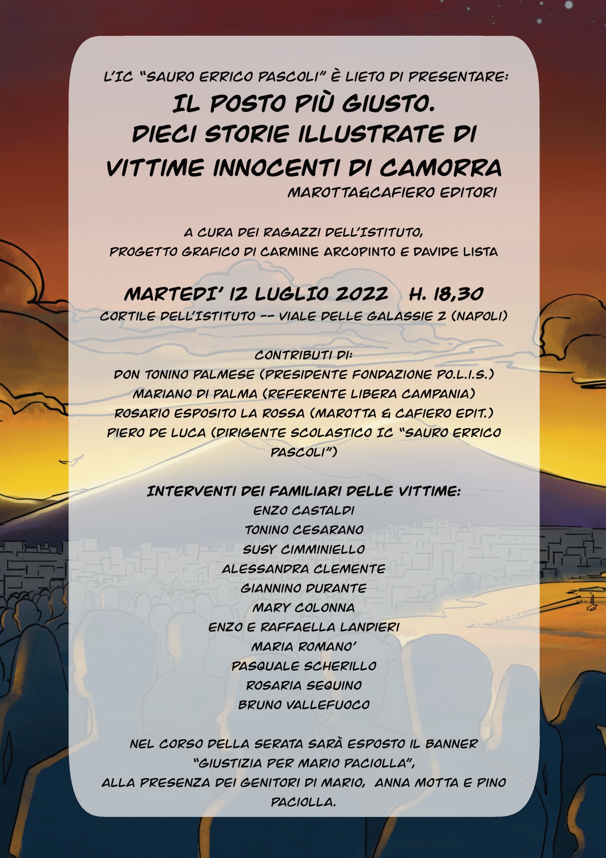 Martedì 12 luglio 2022, alle ore 18.30, presso il cortile dell’IC “Sauro Errico Pascoli”, in viale delle Galassie 2 (Napoli), sarà presentato “Il posto più giusto. Dieci storie illustrate di vittime innocenti di camorra” (Marotta & Cafiero Editori).