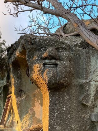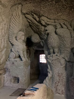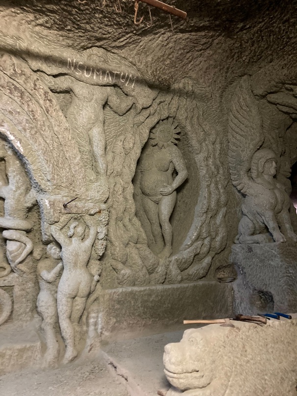 Dopo esserci inerpicate, io e le due care amiche che mi hanno proposto la visita, ho fatto la conoscenza di Ambrogio Castaldi, uomo gentile, anticonvenzionale nei costumi e romito nelle abitudini, un uomo in cerca di senso e risposte, che pare aver trovato nel ciclo della vita, nell’erotismo, soprattutto, che induce Adamo ed Eva a conoscere il piacere e a riprodursi aprendo la storia all’eterno dualismo male/bene – Caino/Abele da lui raffigurati simbolicamente con la sfinge e l’aquila all’interno della ex cantina di casa, trasformata in una sorta di tempio istoriato. L’ aquila svetta, in pietra bianca, anche sulla sommità della casa come a confermare la scelta dello scultore in direzione del bene e della libertà.