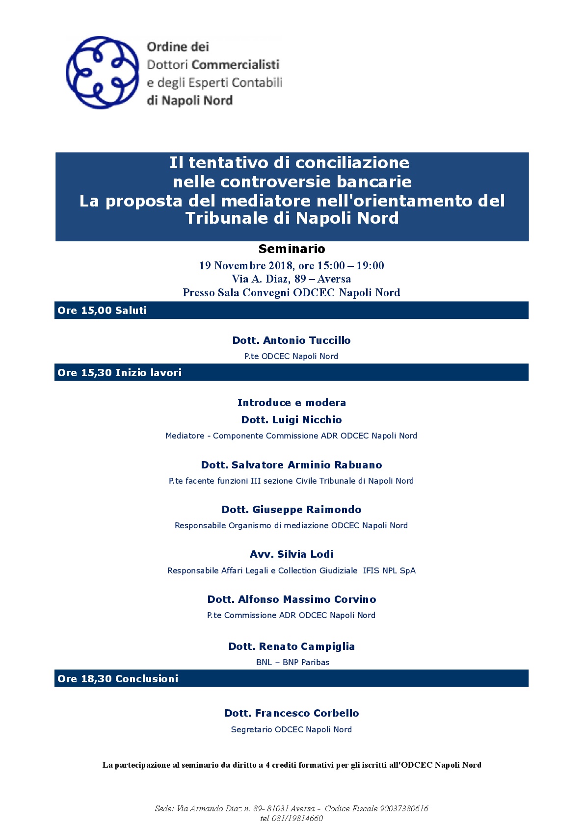 A moderare gli interventi penserà Luigi Nicchio, commercialista ed esperto mediatore, mentre a rappresentare il punto di vista dei mediatori saranno Massimo Corvino – p.te della commissione ADR dell’Ordine dei Commercialisti, e Giuseppe Raimondo – responsabile dell’Organismo di mediazione dell’Ordine dei Commercialisti di Napoli Nord.