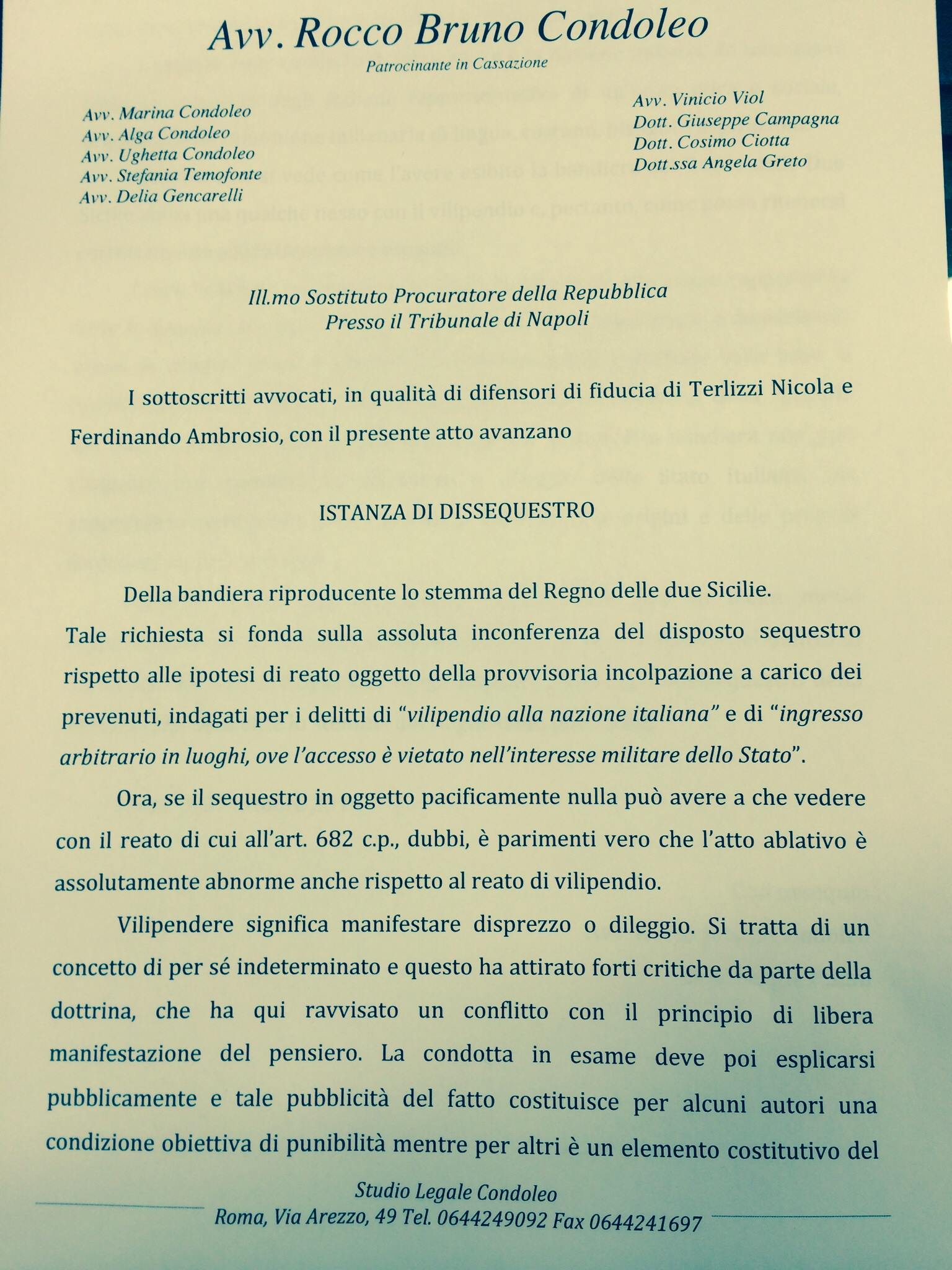 Un gruppo di avvocati sta intanto seguendo da vicino la questione. Tra questi il noto penalista Sergio Pisani che, insieme all’avvocato Rocco Bruno Condoleo, ha stilato il testo di una istanza che chiede il dissequestro della bandiera duosiciliana sequestrata dalla Digos quale “corpo del reato”. “Se i fatti sono andati effettivamente come li hanno raccontato i ragazzi – ha dichiarato l’avvocato Sergio Pisani – non esiste alcun presupposto per i reati che gli sono stati contestati”. Resta ancora da capire, infatti, come abbiano fatto due persone con una vistosa bandiera ad entrare all’interno di una caserma ben piantonata da guardie armate.