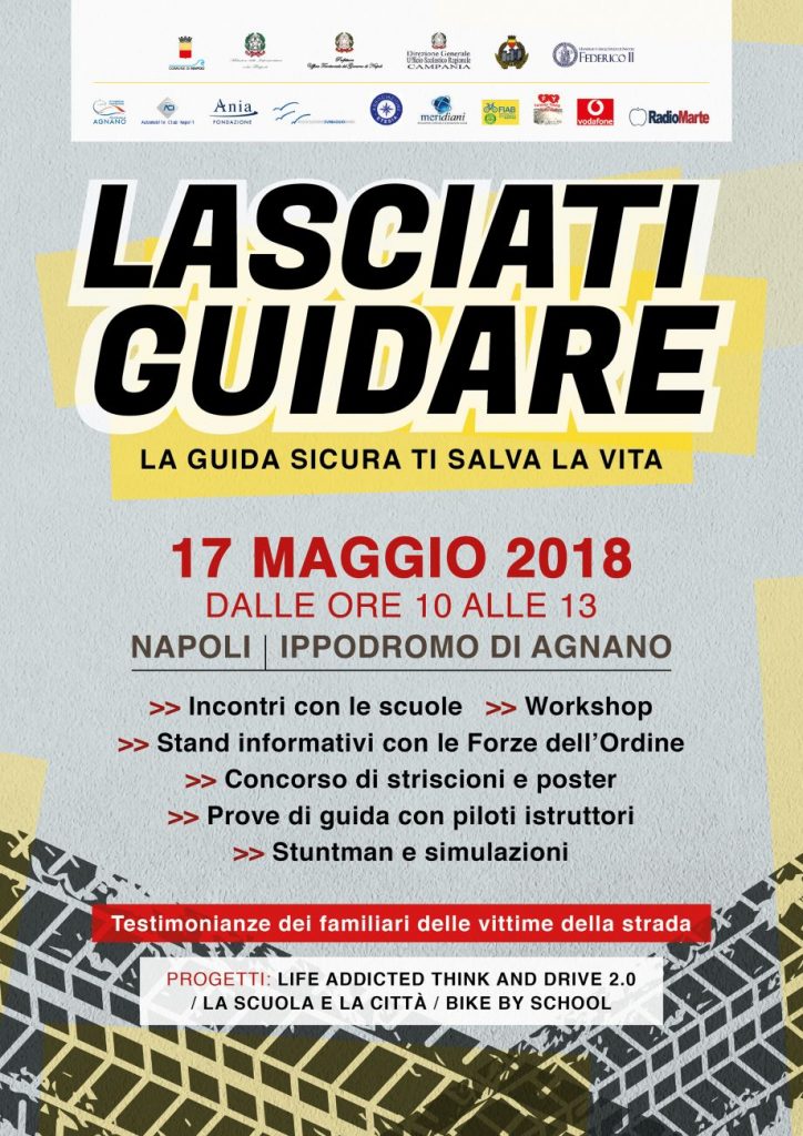 Giovedì 17 maggio dalle ore 10:00 alle ore 13:00, presso l’Ippodromo di Agnano, dove si svolgerà l’iniziativa “Lasciati Guidare” organizzata dal Comune di Napoli, promossa dall’Assessorato ai Giovani, dall’Assessorato all’Istruzione, su impulso delle associazioni di familiari di vittime della strada operanti sul territorio ed a livello nazionale, come l’Associazione XV Maggio 2011, nata dopo il tragico incidente di Via Petrarca nel quale persero la vita tre giovanissimi, Gianmaria De Gregorio, Gianluca Del Torto e Oliviero Russo e l’Associazione Forever Young in memoria di Mario Pisco vittima 17enne di un incidente stradale in Via P. Castellino nel 2011.
