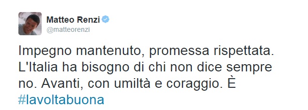 “Missione compiuta. Il governo ha mantenuto l’impegno. Abbiamo promesso, abbiamo mantenuto”, ha detto il ministro Boschi dopo l’ok. ‘Impegno mantenuto’, ha tweettato Matteo Renzi.