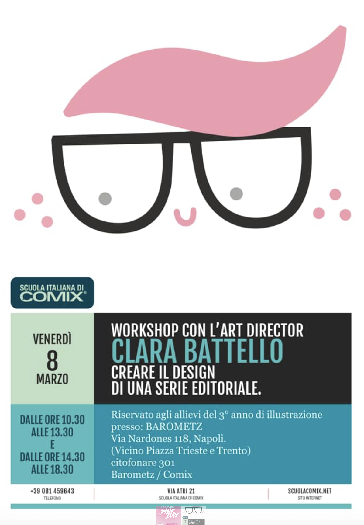 In un momento storico in cui si tanto si parla della crisi dell’editoria, la Scuola Italiana di Comix reagisce invitando l’Art director Clara Battello a Napoli l’8 marzo per il workshop “Creare il design di una serie editoriale”, dedicato gli alunni della Scuola Italiana di Comix. Una vera e propria icona dell’Illustrazione per l’editoria e non solo, la cui presenza segnerà i traguardi raggiunti da allievi ed ex allievi del corso di Illustrazione. Il corso infatti offre importanti opportunità lavorative, e le carriere avviate e in avviamento saranno celebrate ad un party privato promosso dalla Scuola Italiana di Comix: il Pink Day. La giornata con Clara inizierà insieme agli alunni che seguiranno il workshop, per poi continuare la sera con il party, durante il quale chi la segue come artista, desidera conoscerla o farsi firmare libri e scattare qualche foto, potrà farlo a partire dalle ore 20:00 in Via Nardones 118 a Napoli. L’evento è su invito e organizzato in collaborazione con Barometz edizioni. La serata sarà caratterizzata da un apericena e tante sorprese, presso sede della casa editrice. Performance dell’attrice e performer Fanny Damour.