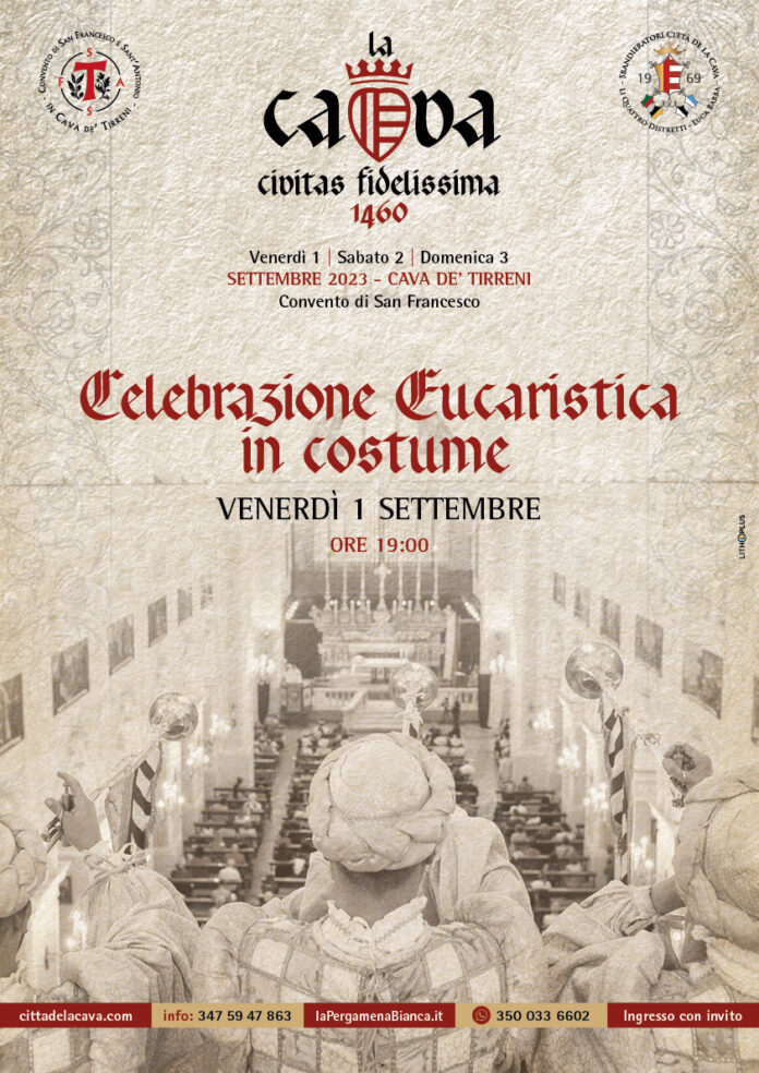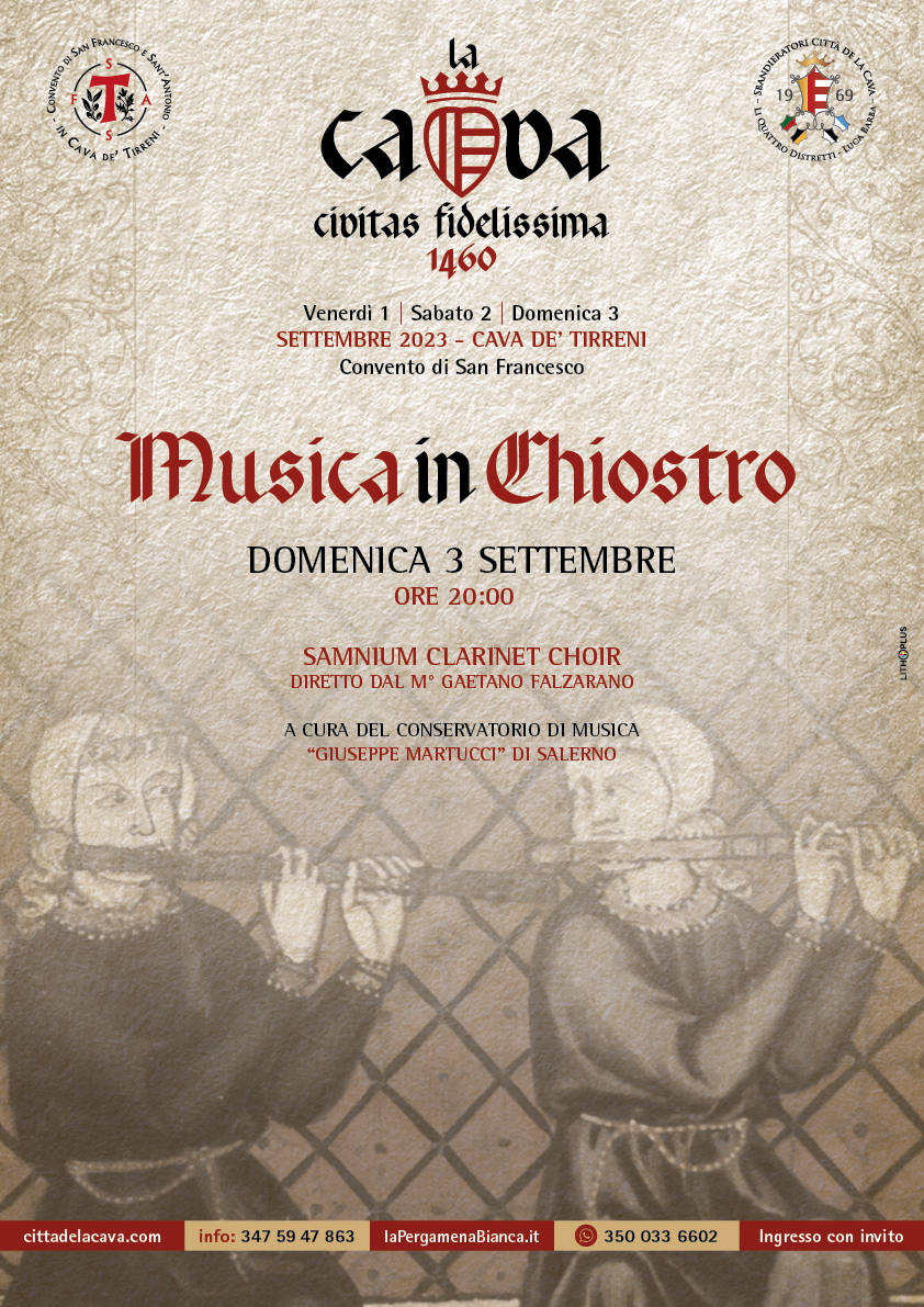 Ufficiale il programma della manifestazione “La Cava, civitas fidelissima 1460” che si terrà a Cava de’ Tirreni dall’1 al 3 settembre al Convento di S. Francesco e S. Antonio. Messa in costume, corteo e spettacolo teatrale ed un ensemble di clarinetti a cura del Conservatorio di Salerno.