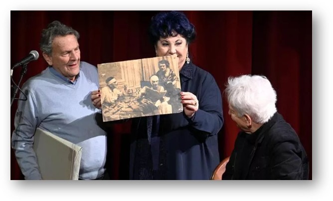 Nella foto di Riccardo Siano (20 marzo 2025), Giuliano Longone Viviani regala al Trianon Viviani una foto originale di La Festa di Montevergine. Da sx: Giuliano Longone Viviani, il direttore artistico Marisa Laurito e Nello Mascia.