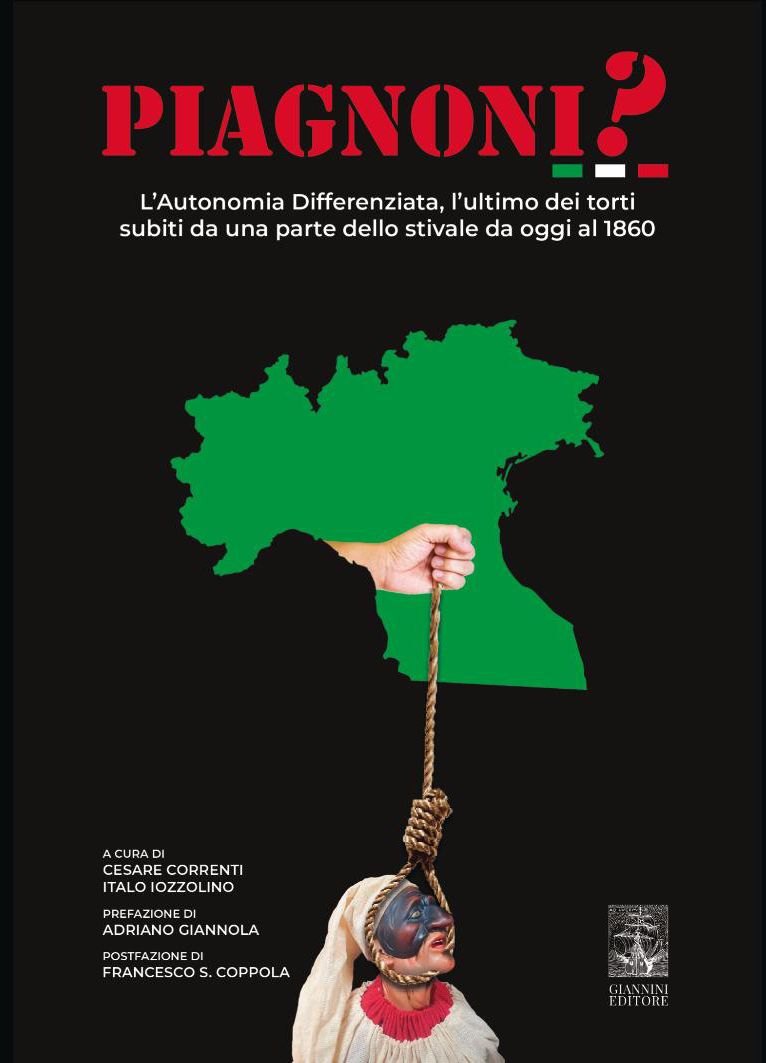 “Piagnoni?” è un instant book di quattrocento pagine sull’argomento caldo del momento, quello della Autonomia differenziata che vede una legge passata in Parlamento e un referendum abrogativo in via di definizione. I due curatori raccolgono brevi saggi, interventi e opinioni di meridionalisti autorevoli a cominciare da Adriano Giannola (presidente dello SVIMEZ) che ne scrive la prefazione. Con scritti di Pino Aprile, Marco Ascione, Raimondo Augello, Ciro Borrelli, Franco Cafararo, Ambrogio Carpentieri, Francesco Antonio Cefalì, Francesco Saverio Coppola, Cesare Correnti, Michele Eugenio Di Carlo, Marco Esposito, Enrico Fagnano, Giuseppe Gangemi, Ciro Giuliano, Daniele Elpidio Iadicicco, Italo Iozzolino, Marta La Greca,Antonio Lombardi, Massimo Mastruzzo, Patrizia Morlacchi, Antonio Picariello, Annamaria Pisapia, Rossella Solombrino, Patrizia Stabile, Ubaldo Sterlicchio, Ciro Tarallo, Aldo Vella, Fabio Vitale, Emilio Zangari, Pietro Busetta e Antonio Corvino.