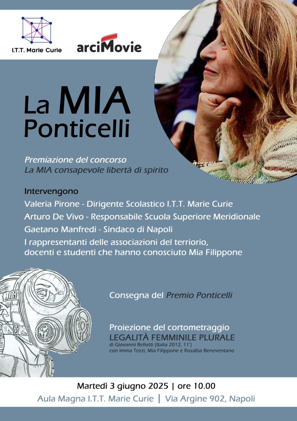 A seguire la consegna del “Premio Ponticelli” che, in via del tutto straordinaria e per la prima volta, è stato assegnato a una persona non più in vita. È l’iniziativa di Arci Movie, Casa del Popolo Ponticelli, associazione “Il Quartiere Ponticelli” e TerradiConfine che dedicano tale riconoscimento a Mia Filippone per aver contribuito alla crescita di Napoli e, in particolare, del territorio orientale grazie al suo lavoro di dirigente scolastica e, poi, di amministratore pubblico. Segue la presentazione di opere audiovisive inedite tra cui il corto “Legalità femminile plurale” di Giovanni Bellotti (Italia, 2021, 11’) prodotto da Arci Movie e di altre clip che raccontano l’impegno e la forte personalità di tre protagoniste tra cui l’ex preside e vicesindaca: in particolare, per la prima volta, saranno trasmesse immagini che raccontano le esperienze della Filippone nel corso dei suoi diversi incarichi pubblici.