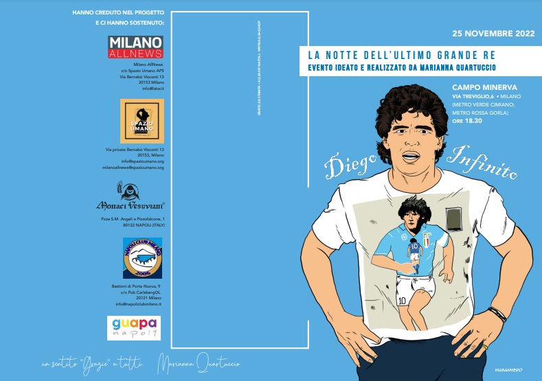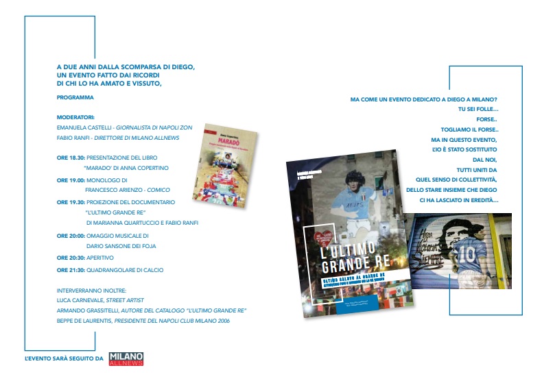 “Felice ed emozionata nell’annunciarvi ‘La notte dell’Ultimo grande Re’, un evento che si terrà a Milano il 25 novembre. Tutto ruoterà attorno ad un campo di calcetto, il luogo da dove è nato il mito. Sarà una serata tra libri, proiezioni, foto, birra e musica; sarà una serata tra amici; sarà l’evento di chi vorrà omaggiare Dios”. Con queste parole, Marianna Quartuccio ha annunciato l’evento da lei ideato che si terrà il prossimo 25 novembre, secondo anniversario della morte di Diego Armando Maradona, a Milano, presso il campo Minerva, via Treviglio 6, dalle ore 18.30 alle ore 22.30. Nel corso dell’evento ci sarà anche la presentazione del libro “Maradò” di Anna Copertino.