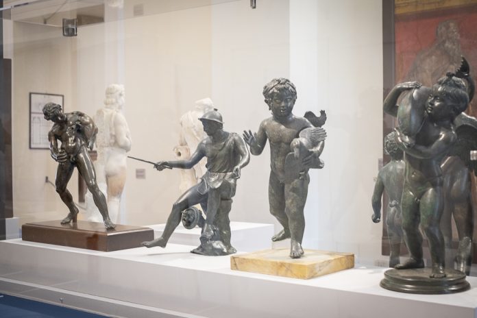 Il percorso, curatrici Laura Forte e Marialucia Giacco, si apre con una serie di meraviglie: un cratere a volute con corteo bacchico in marmo, un sgabello con maschere e motivi vegetali. Adornavano gli ambienti esterni bocche di fontana bronzee con pescatore e Amorino e oca ( della Fontana Piccola), con satiro che regge un otre (Casa del centenario) e con Amorino e delfino; e ancora gli oscilla in marmo (decorazioni sospese). Tante le curiosità: da una pelvis (bacino per le abluzioni) proviene l’applique bronzea di una giovane che si lava i capelli.
