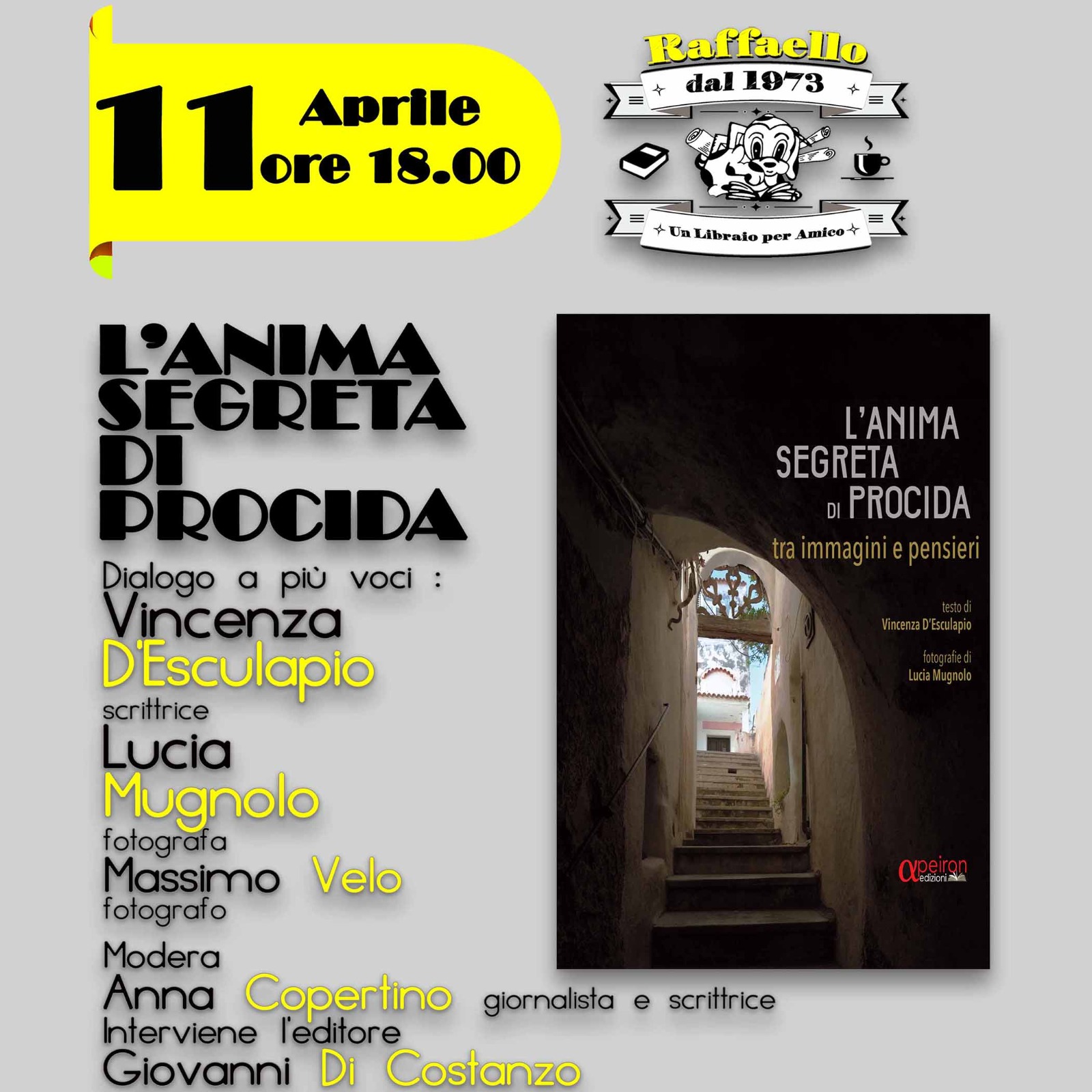Giovedì 11 aprile, presso la libreria Raffaello, a Napoli, si terrà la presentazione del libro “L’anima segreta di Procida tra immagini e pensieri”, testo di Vincenza D’Esculapio e fotografie di Lucia Mugnolo.