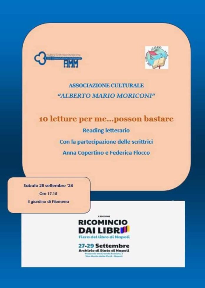 Per il terzo anno consecutivo l’Associazione Culturale “Alberto Mario Moriconi” parteciperà a “Ricomincio dai libri” che si terrà dal 27 al 29 settembre presso la sede Dell’Archivio di Stato di Napoli, già location della scorsa, edizione.