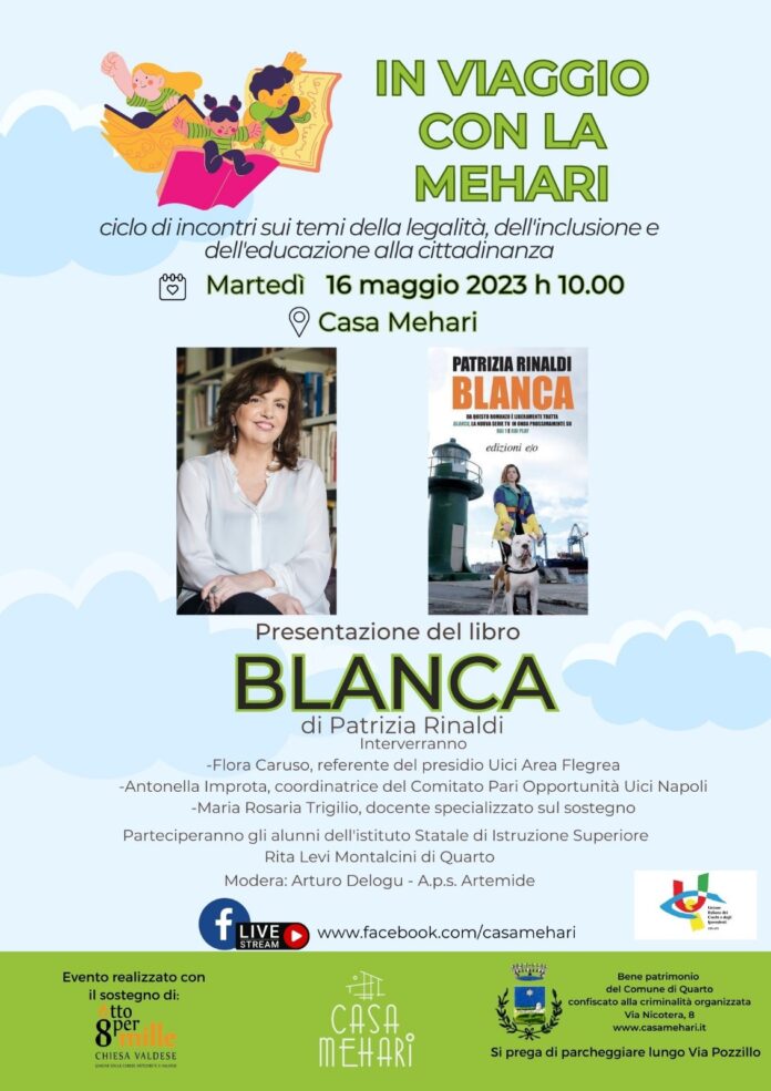 Martedì 16 maggio (ore 10) sarà ospite di Casa Mehari – via Nicotera n. 8, Quarto, Napoli – la scrittrice Patrizia Rinaldi che presenterà Blanca, la protagonista dei romanzi da cui è tratta l’omonima serie televisiva trasmessa dalla Rai e diffusa in Spagna, Francia e Canada.