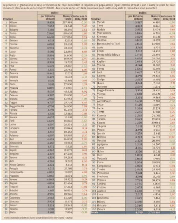 Numeri a sorpresa nella classifica de Il Sole 24 ore con le città più pericolose d’Italia