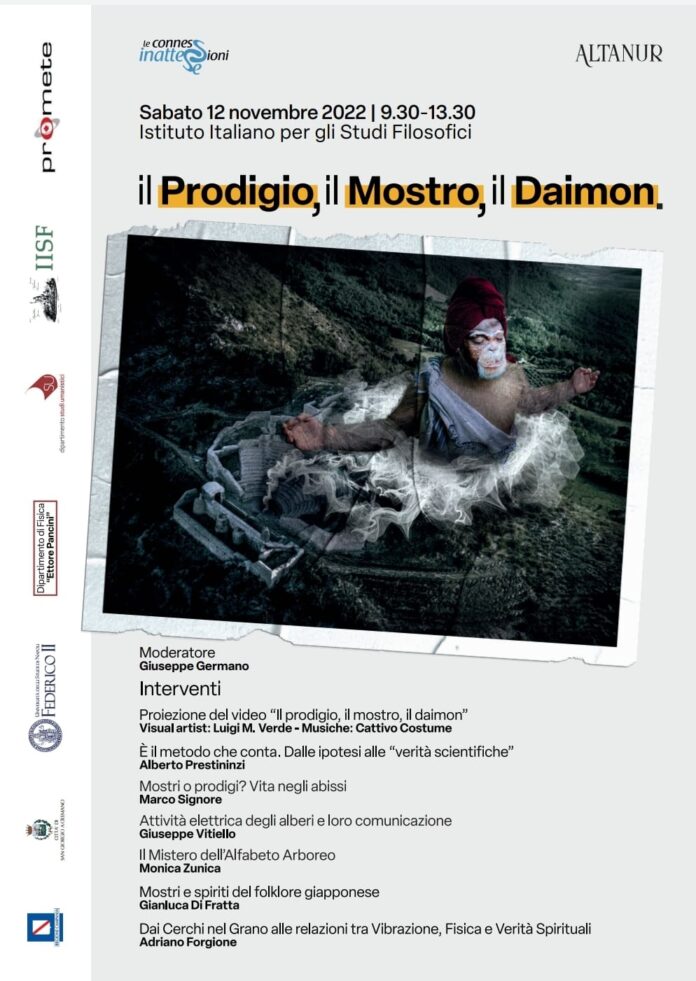 Sabato 12 Novembre 2022 si terrà il Convegno Le Connessioni Inattese 2022 dal titolo «IL PRODIGIO, IL MOSTRO, IL DAIMON», ore 9.30 – 13.30, presso l’Istituto Italiano per gli Studi Filosofici, Palazzo Serra di Cassano in Napoli. L’Associazione ALTANUR, che organizza l’evento in collaborazione con l’Istituto Italiano per gli Studi Filosofici e con la PROMETE Srl_CNR Spin off Company, porterà all’attenzione del pubblico una serie di temi di punta trattati da scienziati di calibro internazionale e da personaggi del mondo dei media secondo un fil rouge insospettato e poco convenzionale. Il Progetto Le Connessioni Inattese infatti nasce nel 2007 per: