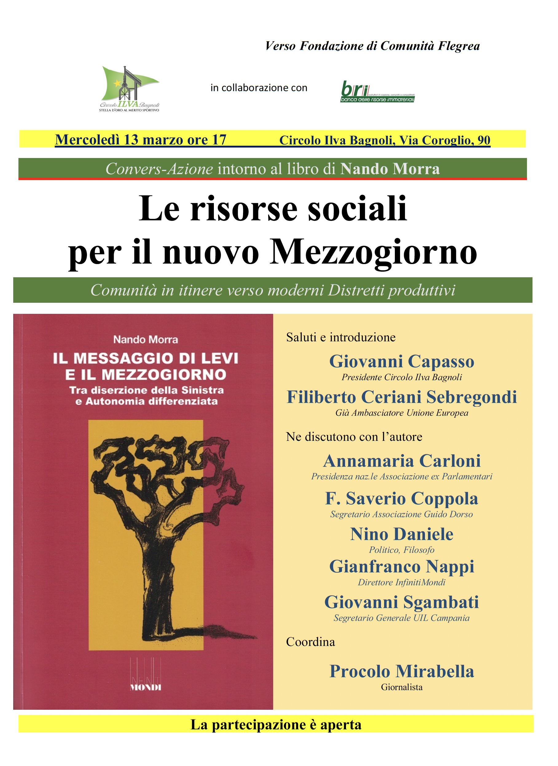 Mercoledì 13 marzo 2024, alle ore 17, presso il Circolo Ilva Bagnoli, in via Coroglio 90, si terrà un convegno del nuovo ciclo di iniziative culturali “Verso Fondazione di Comunità Flegrea”, in continuità con il precedente “Territorio e Comunità. La coesione sociale per lo sviluppo”.