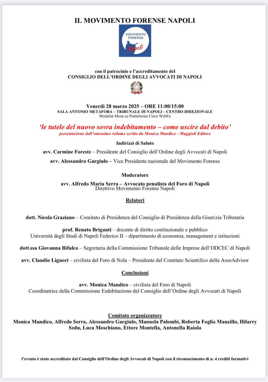 Movimento Forense Napoli, con il patrocinio e l’accreditamento del Consiglio dell’Ordine degli Avvocati di Napoli, presenta il convegno dal titolo “Le tutele del nuovo sovra indebitamento – come uscire dal debito”.