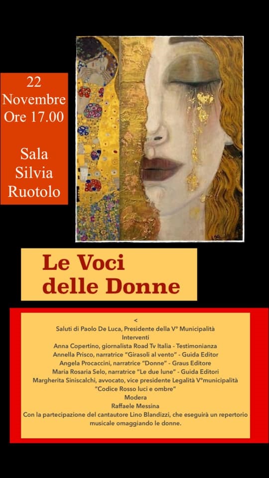 Venerdì 22 Novembre, alle ore 17:00 presso la Sala Consiliare ‘Silvia Ruotolo’ della V Municipalità (in via Raffaele Morghen, 84, Napoli) si terrà l’importante evento dal titolo ‘Le voci delle donne’, in occasione della giornata internazionale contro la violenza di genere di lunedì 25 novembre.