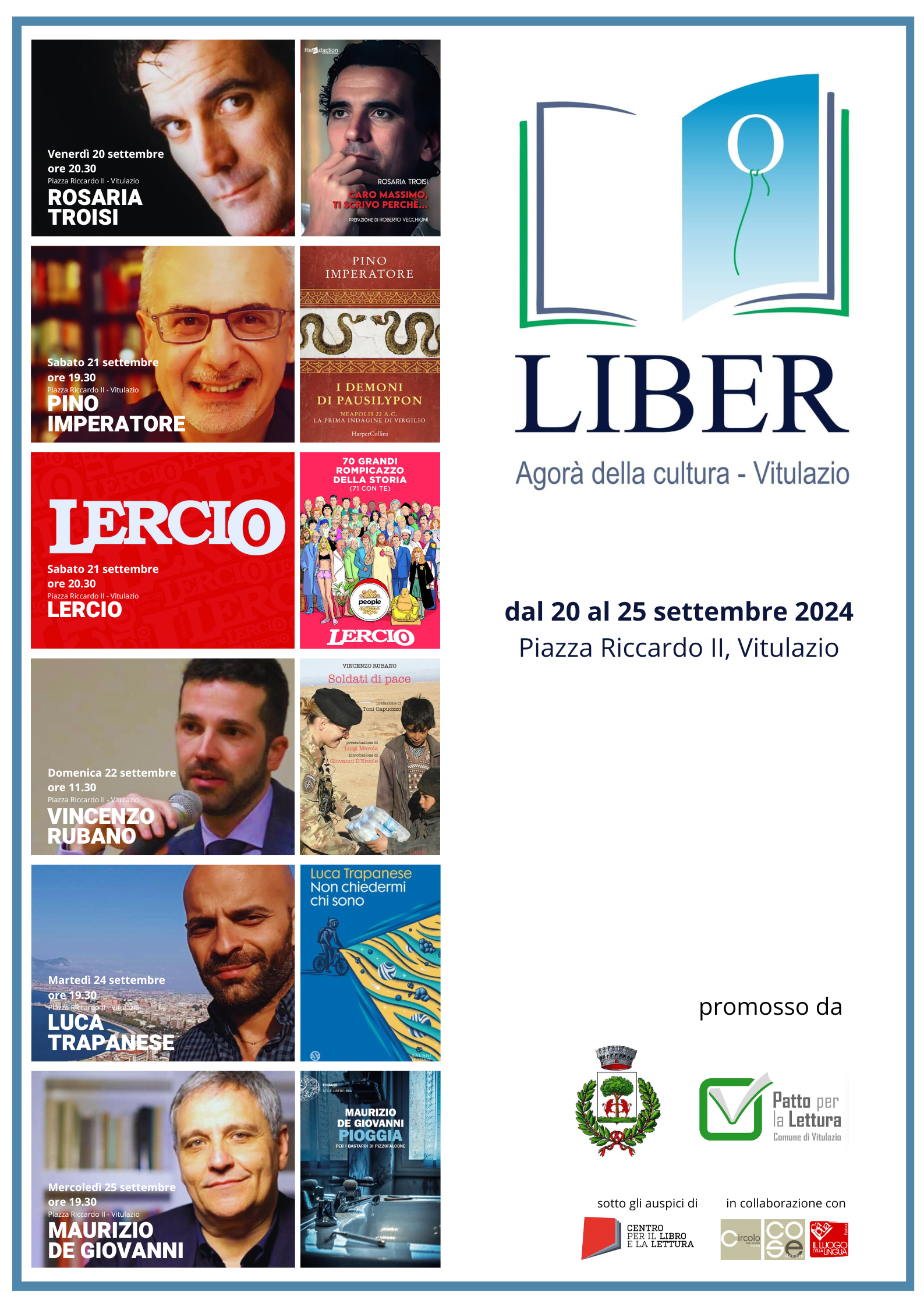 Maurizio De Giovanni, Rosaria Troisi, Pino Imperatore, Luca Trapanese, Vincenzo Rubano, e gli autori del giornale satirico “Lercio” saranno gli ospiti della rassegna “Liber Agorà della Cultura”, l’evento letterario che dal 20 al 25 settembre a Vitulazio darà il benvenuto ad alcuni dei più significativi protagonisti del panorama letterario italiano.