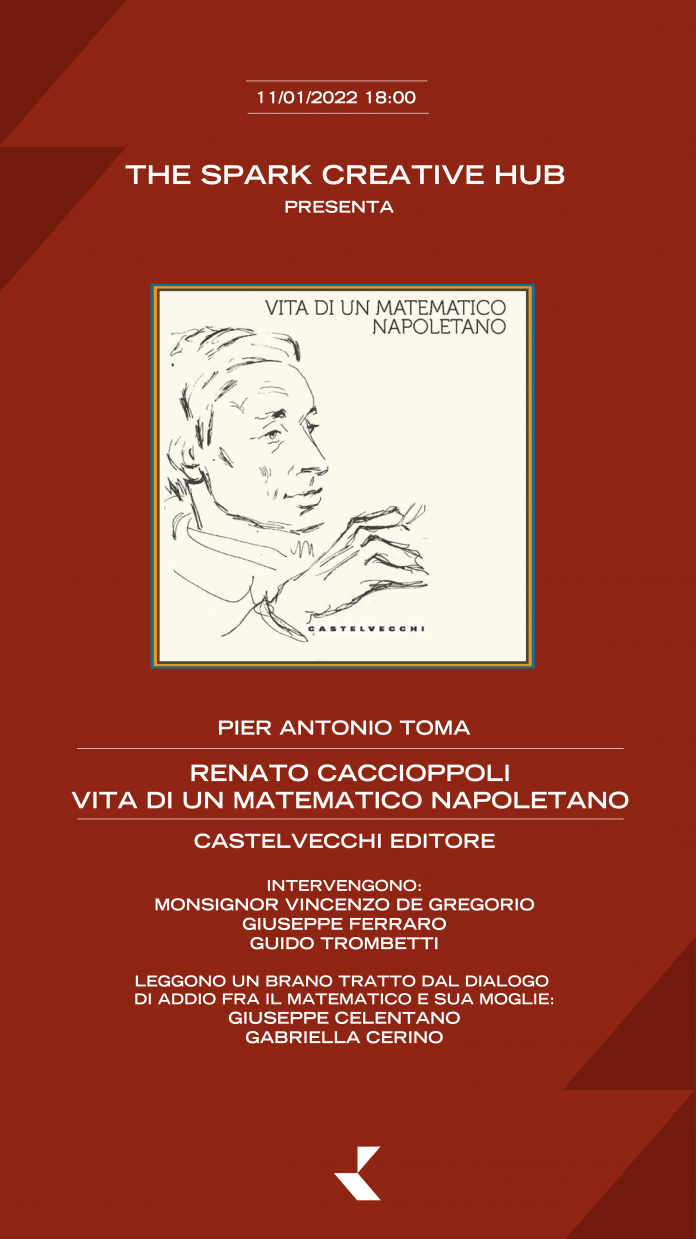 Martedì 11 gennaio alle 18 nella libreria Spark (via degli Acquari – Piazza Bovio 33 – Napoli) verrà presentato il libro Renato Caccioppoli – Vita di un matematico napoletano (Castelvecchi) di Piero Antonio Toma. Ne parleranno con l’autore il matematico ed ex-rettore dell’università Federico II, Guido Trombetti, il musicologo e già direttore del Conservatorio San Pietro a Majella, mons. Vincenzo De Gregorio, e il filosofo Giuseppe Ferraro, docente di Etica sociale e dell’Ambiente. Gli attori Giuseppe Celentano e Gabriella Cerino leggeranno un brano tratto dal dialogo di addio fra il matematico e la moglie Sara.