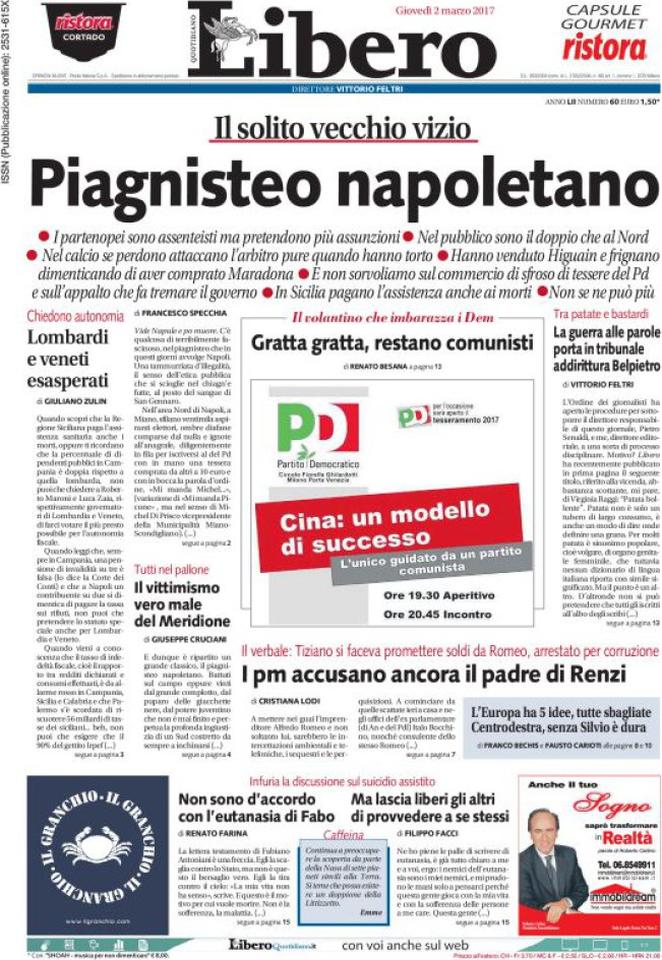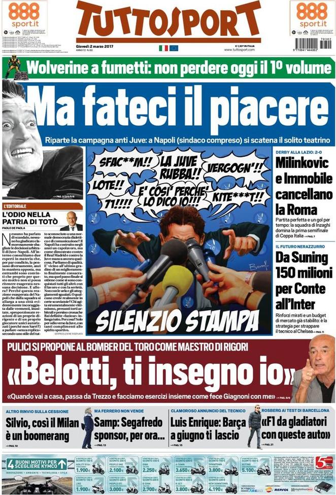 Ovviamente, come da perfetto Sputtanapoli, qualcuno ha utilizzato il giusto sdegno del club partenopeo, contro il Napoli stesso. E’ il caso di Tuttosport e Libero, che oggi sono usciti con dei titoli a tutta pagina che si commentano da soli. Il “piagnisteo napoletano” e, forse peggio ancora la citazione del grande Totò, fatta dal quotidiano in bianconero, il cui direttore evidentemente conosce bene in quanto napoletano di nascita, miste a una serie di luoghi comuni, non fanno altro che certificarne la valenza e il valore.