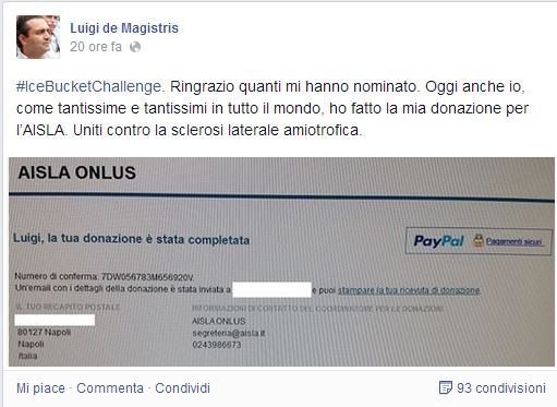 Dopo che la #IceBucketChallenge è sbarcata anche a Napoli, in molti sono stati i personaggi che hanno chiesto la partecipazione del sindaco di Napoli per dare il buon esempio. Finalmente, pare che Luigi De Magistris abbia deciso di dare il suo contributo, ma senza doccia gelata. Per lui solo una donazione per l’Aisla e un mesaggio su Facebook in cui si vede la foto del suo gesto. La cifra della donazione è stata oscurata. ”Ringrazio quanti mi hanno nominato. Oggi anche io, come tantissime e tantissimi in tutto il mondo, ho fatto la mia donazione per l’Aisla. Uniti contro la sclerosi laterale amiotrofica”