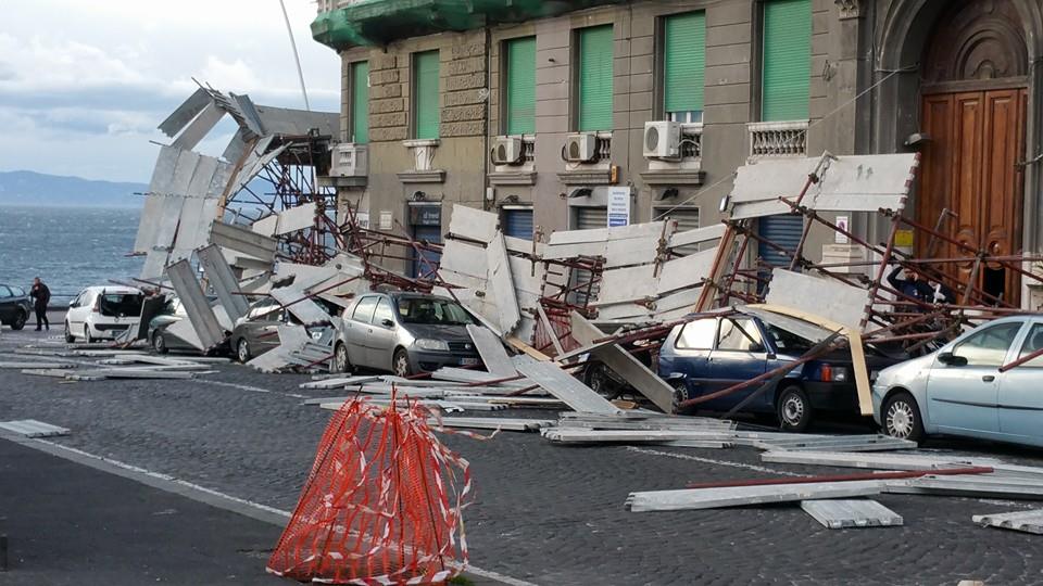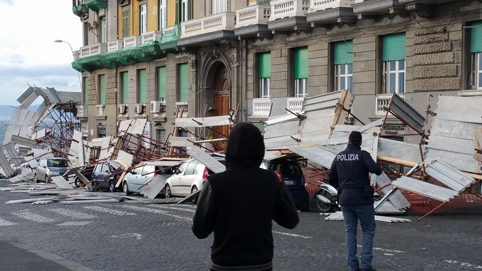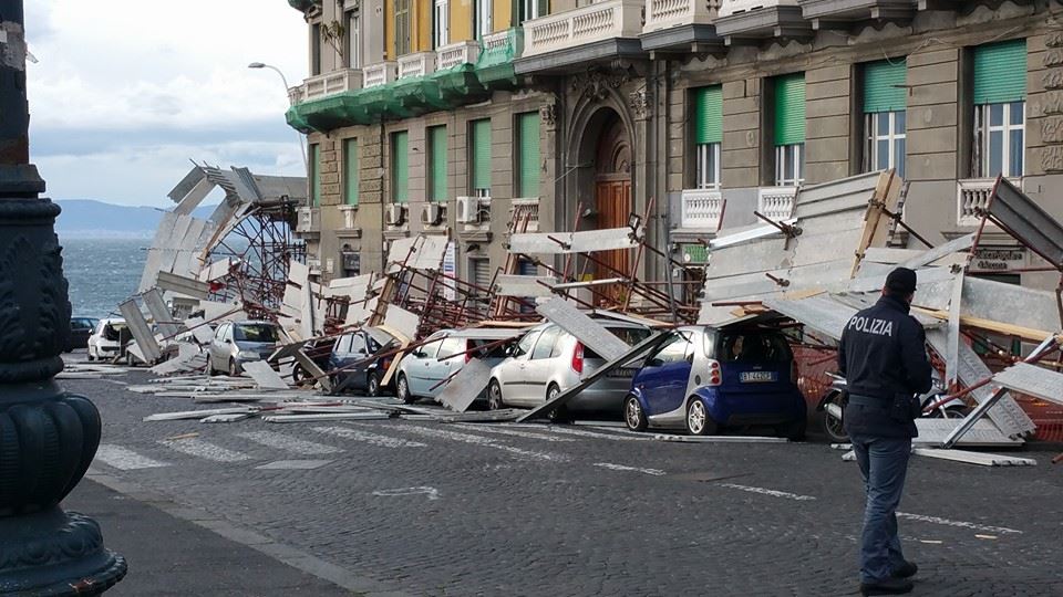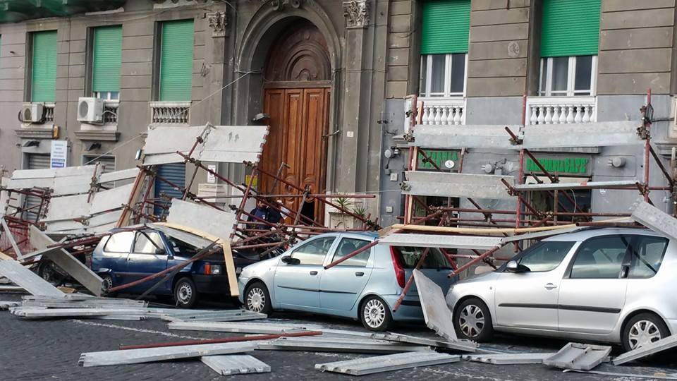 Questa mattina, invece, il vento forte ha fatto crollare una impalcatura di un palazzo tra via Santa Lucia e via Cesario Console, a pochi passi dal lungomare di Napoli. Anche qui fortunatamente non si sono registrati feriti, solo danni ad auto (come da foto scattate da Pasquale Popolizio). Polizia municipale e i vigili del fuoco, con l’aiuto di alcuni operai, sono sul posto e in queste ore stanno mettendo in sicurezza la zona. La Sciabolata Artica a Napoli non ha nemmeno risparmiato il Palazzo San Giacomo, dove vi è la sede del Comune di Napoli, provocando la caduta di alcuni calcinacci. Anche qui nessun ferito e danni lievi.