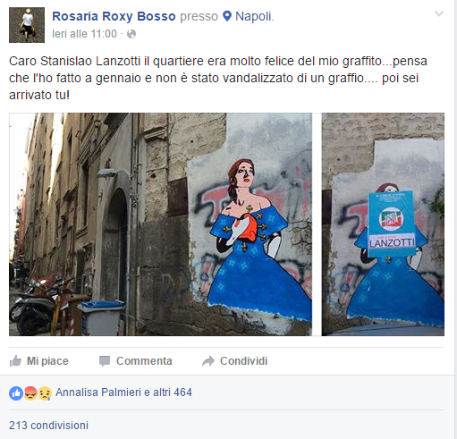 Manifesti della destra che rovinano completamente le opere di street art ai Quartieri Spagnoli. Il post di denuncia arriva direttamente da Rosaria Roxy Bosso, artista che, con i suoi stencil, ha reso ancora più belli alcuni luoghi di Napoli. Le sue opere raffigurano personaggi del mondo del cinema, della letteratura e che, in tanti modi, sono tutt’oggi legati a Napoli. Ma a rovinare quelle opere ci hanno pensato i manifesti di Stanislao Lanzotti che hanno ricoperto interamente gli stencil.