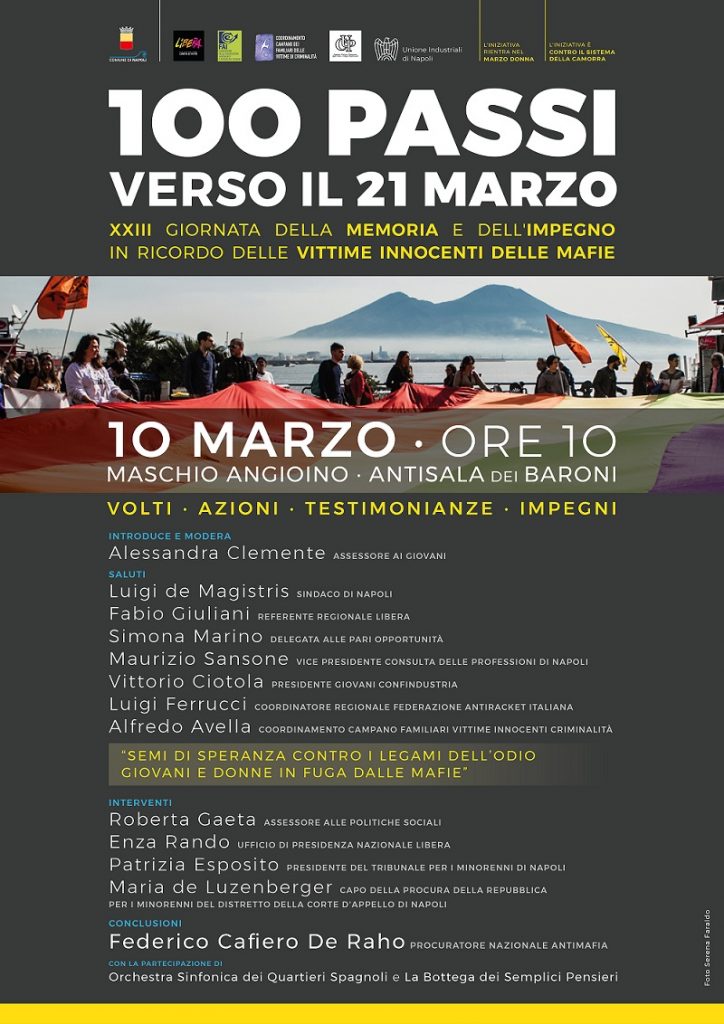 Sabato 10 marzo alle ore 10:00, presso la Sala dei Baroni al Maschio Angioino, con la presenza del Sindaco, Luigi de Magistris, il Procuratore Nazionale Antimafia, Federico Cafiero de Raho ed Enza Rando, dell’Ufficio di Presidenza di Libera, al via l’iniziativa “100 Passi verso il 21 marzo“.