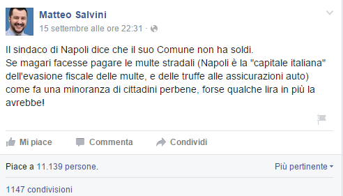 Matteo Salvini, in un post sul suo profilo ufficiale Facebook scrive: “Il sindaco di Napoli dice che il suo Comune non ha soldi. Se magari facesse pagare le multe stradali (Napoli è la “capitale italiana” dell’evasione fiscale delle multe, e delle truffe alle assicurazioni auto) come fa una minoranza di cittadini perbene, forse qualche lira in più la avrebbe”.