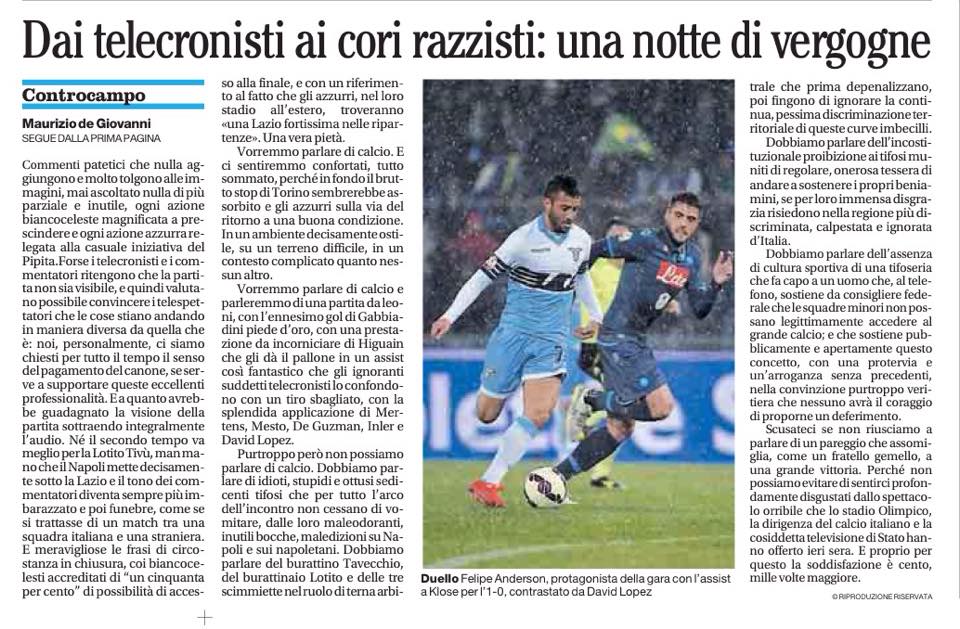Tutto è partito quando, lo scorso mercoledì 4 marzo, la squadra del Napoli si è scontrata in campo con quella della Lazio durante la semifinale di andata all’Olimpico per la Coppa Italia. La partita è stata trasmessa in diretta dalla Rai dove la telecronaca del match è stata fortemente sbilanciata a favore della Lazio. Da subito sul web si è scatenata una bufera contro il commento “tecnico” di Marco Tardelli accusato di essere stato imparziale, ed ecco che il giornalista e scrittore Maurizio De Giovanni ha voluto dare voce ai migliaia di tifosi indignati scrivendo un articolo su Il Mattino che rinomina la Rai una “Lotito TV“. “Commenti patetici che nulla aggiungono e molto tolgono alle immagini, mai ascoltato nulla di più parziale e inutile, ogni azione biancoceleste magnificata a prescindere e ogni azione azzurra relegata alla casuale iniziativa del Pipita. Forse i telecronisti e i commentatori ritengono che la partita non sia visibile, e quindi valutano possibile convincere i telespettatori che le cose stiano andando in maniera diversa da quella che è: noi, personalmente, ci siamo chiesti per tutto il tempo il senso del pagamento del canone, se serve a supportare queste eccellenti professionalità. E a quanto avrebbe guadagnato la visione della partita sottraendo integralmente l’audio. Né il secondo tempo va meglio per la Lotito Tivù, man mano che il Napoli mette decisamente sotto la Lazio e il tono dei commentatori diventa sempre più imbarazzato e poi funebre, come se si trattasse di un match tra una squadra italiana e una straniera“.